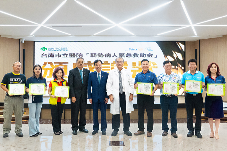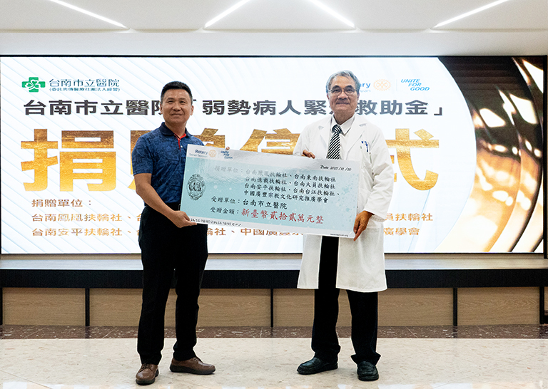 台南大員扶輪社、台南鳳凰扶輪社、台南東南扶輪社、台南億載扶輪社、台南安平扶輪社、台南台江扶輪社以及中國廣豐宗教文化研究推廣學會,匯集社友愛心捐贈22萬元「弱勢病人緊急救助金」予台南市立醫院,以減輕經濟弱勢者的醫療負擔,期望有需要的人在艱難時刻都能獲得即時協助與社會的溫暖支持。