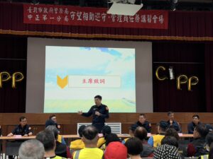 本次訓練課程除指派專人講授CPR緊急救護、家庭暴力防治與婦幼安全相關法律知識,更於課程中加入識詐宣導,提昇防詐騙意識,透過深入鄰里的走動轉達給轄區居民,發揮第一線預警功能,成爲警方最得力的助手,達到共同維護社會治安的功能。