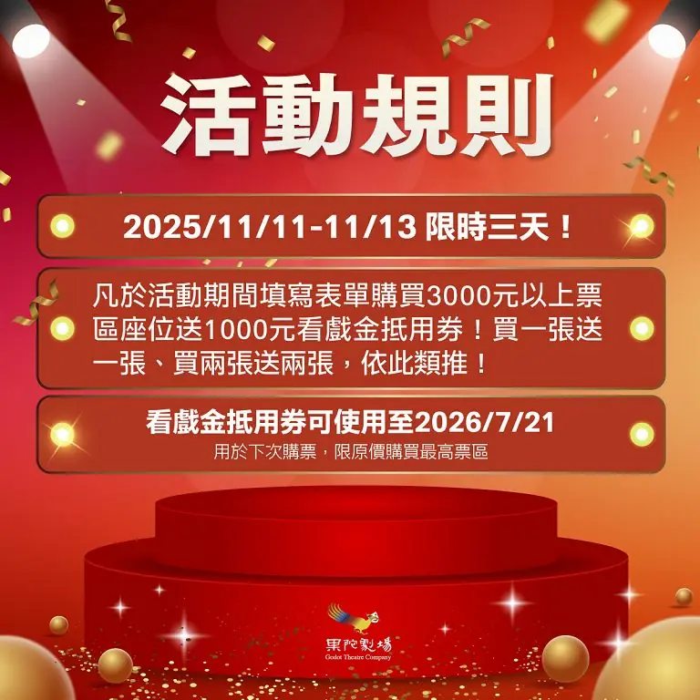 全民普發一萬元熱潮延燒,果陀劇場也趁勢推出「雙11千元看戲金」限時活動回饋觀眾。凡於11月11日至13日期間購買果陀任一票價3,000元(含)以上門票,即可獲得1,000元「看戲金」抵用券乙張,下次購票可折抵使用至2026年7月21日止。