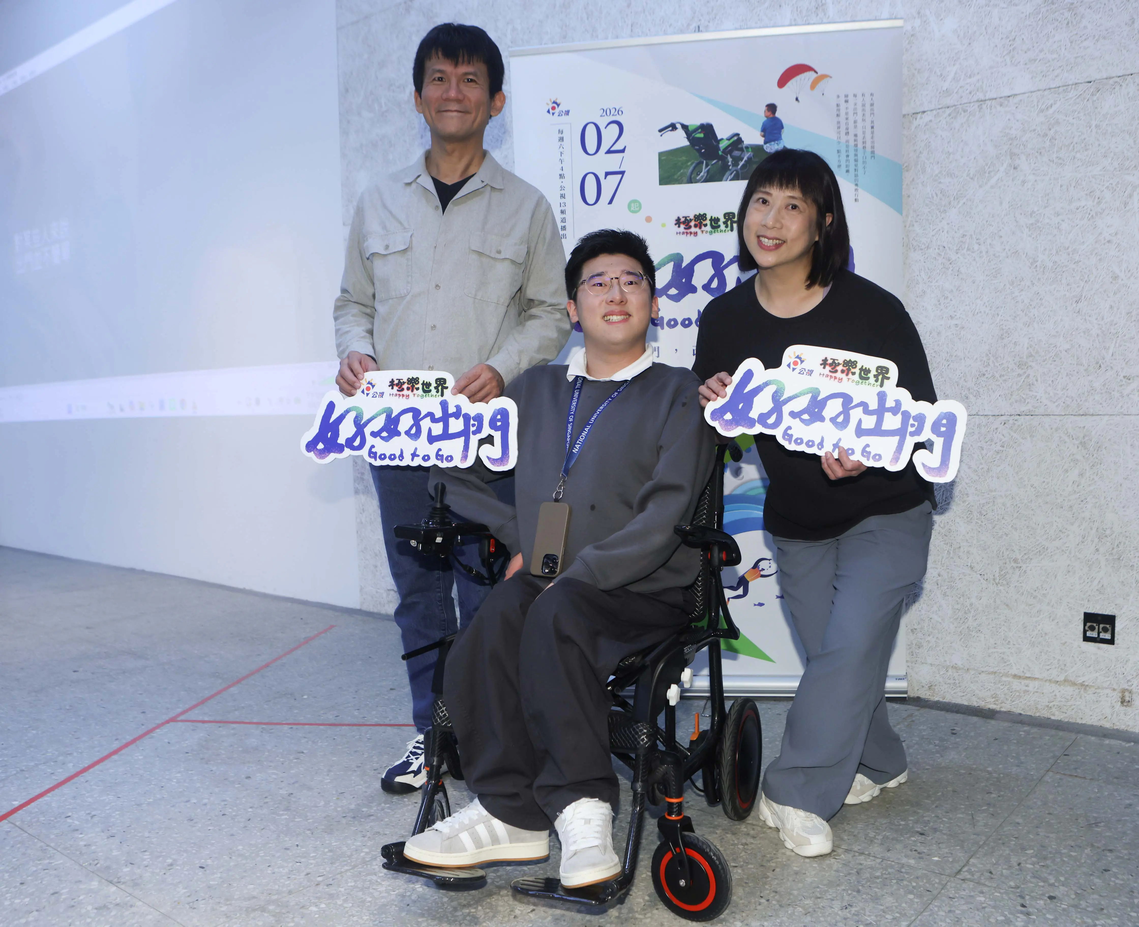 公視身心障礙節目《極樂世界之好好出門》,貼身記錄14位不同障礙者的出門過程,透過輪椅的高度、視障朋友的視野、聽障朋友的耳朵,帶領民眾重新認識障礙者外出時面對的不便與意想不到的奇遇。節目自2月7日起,每週六下午4點公視播出,並於《公視點點愛》YouTube頻道與《公視+》影音串流平台同步上架。 第一集主角莊富凱。 圖片提供:公視 公視副總經理陳昀利表示:「提升國人對身心障礙觀念與權益的理解,並與時俱進,是公共電視自成立以來始終堅持的責任與使命。」本節目由公視節目部製作人陳傳惠歷時2年打造完成。陳傳惠23年前加入台灣第一個聽障節目《聽聽看》的團隊,其後推出全球首部以「聽」為核心的行腳節目《勝利催落去》,再到《極樂世界》,屢獲金鐘獎及國內外影展肯定。此次推出全新系列《極樂世界之好好出門》,她傾注全力製作,「我們也特別感謝10集14位節目主角,以勇氣與行動力,克服每次出門的困難。也期待透過這部作品,促成更多理解與改變,讓每一個人都能自在走向世界,正如英文片名所說——Good to go.」。 《極樂世界之好好出門》第一集主角莊富凱不懼腦麻遠征綠島潛水,透過節目終於排除阻礙實現與魚、海龜同游的夢想。 圖片提供 公視 此外,節目也獲得運動部適應運動司司長林佩君鼎力相挺,林佩君說:「適應運動司成立目的就是推廣運動平權,我們希望如同節目主題,身心障礙朋友都能夠走出家門,享受運動的快樂,踏實的運動。」她也以節目為引,邀請工研院服務系統科技中心組長林宏墩結合賓特立實業,共同為主角莊富凱、顧文凱量身訂製運動輔具,協助他們樂享運動。 第二集主角顧文凱(中)與父母親。 圖片提供 公視 製作人陳傳惠表示:「多年來拍攝身心障礙朋友,感受到他們的生活,從洗衣服、穿衣服,甚至移動,都比一般人還要花更多的時間,也看到他們的生活智慧,我很想要讓大家能夠更看到他們生活的樣貌,進而理解他們,所以製作《極樂世界之好好出門》, 讓大家知道身心障礙者他們的能力有不同的面向。」 《極樂世界之好好出門》第二集主角顧文凱不畏運動感覺神經病變自學滑板,並奪下新加坡青年滾球第二名。 圖片提供 公視 《極樂世界之好好出門》每集30分鐘,共10集,拍攝足跡遍及台灣本島與離島。首集主角莊富凱,人稱凱哥,是一位37歲、熱愛生命、充滿行動力的腦性麻痺朋友。日常生活需居服員或個人助理協助,但只要坐上電動輪椅,他便化身為活力十足的E人,假日行程總是滿檔,看演唱會、滑水樣樣嘗試。他夢想潛入海中,與魚群、海龜悠游,卻因蜷曲的手指無法自行捏鼻平壓潛水面鏡,多次遭到拒絕。這回,他在製作團隊的協助下,遠征綠島挑戰潛水,豁達地說:「我現在不去,就沒有機會!」「就算發生意外也沒關係,因為我現場是快樂的!」 (左起)運動部適應運動司司長林佩君、第二集主角顧文凱、公視副總陳昀利、第一集主角莊富凱。 圖片提供 公視 第二集主角顧文凱,拍攝時就讀台北市建國中學,目前就讀新加坡國立大學財經系二年級,2023年榮獲總統教育獎,2025年榮獲新加坡青年滾球第二名。他罹患先天性運動感覺神經病變,四肢肌肉萎縮,只能以輪椅代步。國中時,他因看見國外身障滑板影片而深受吸引,開始自學滑板,高中時已能熟練挑戰上下斜坡、甩尾轉彎、翹板與下階梯等動作,並剪輯練習影片分享。儘管身體受限,可從事的運動不多,他仍為維持核心力量,積極嘗試滑板、桌球、地板滾球、高爾夫球、游泳等運動。節目更親身記錄他與摯友展開一場難忘的高中畢旅。 好好出門特映會大合照 圖片提供 公視 顧文凱表示:「身障者的身體狀況一直改變,生活上會遇到不方便的挑戰也會一直改變,在國外留學沒有像台北有那麼便利的設施可以去滑板,幸而接觸肌肉萎縮協會相關單位,就開始地板滾球運動。」身障者運動需要發揮智慧量身打造輔具,顧文凱父親以彈性繃帶打造玩滑板防止磨擦的輔具,更發揮曾服務科技公司的專業技能,以3D列印為顧文凱打造地板滾球置球架。