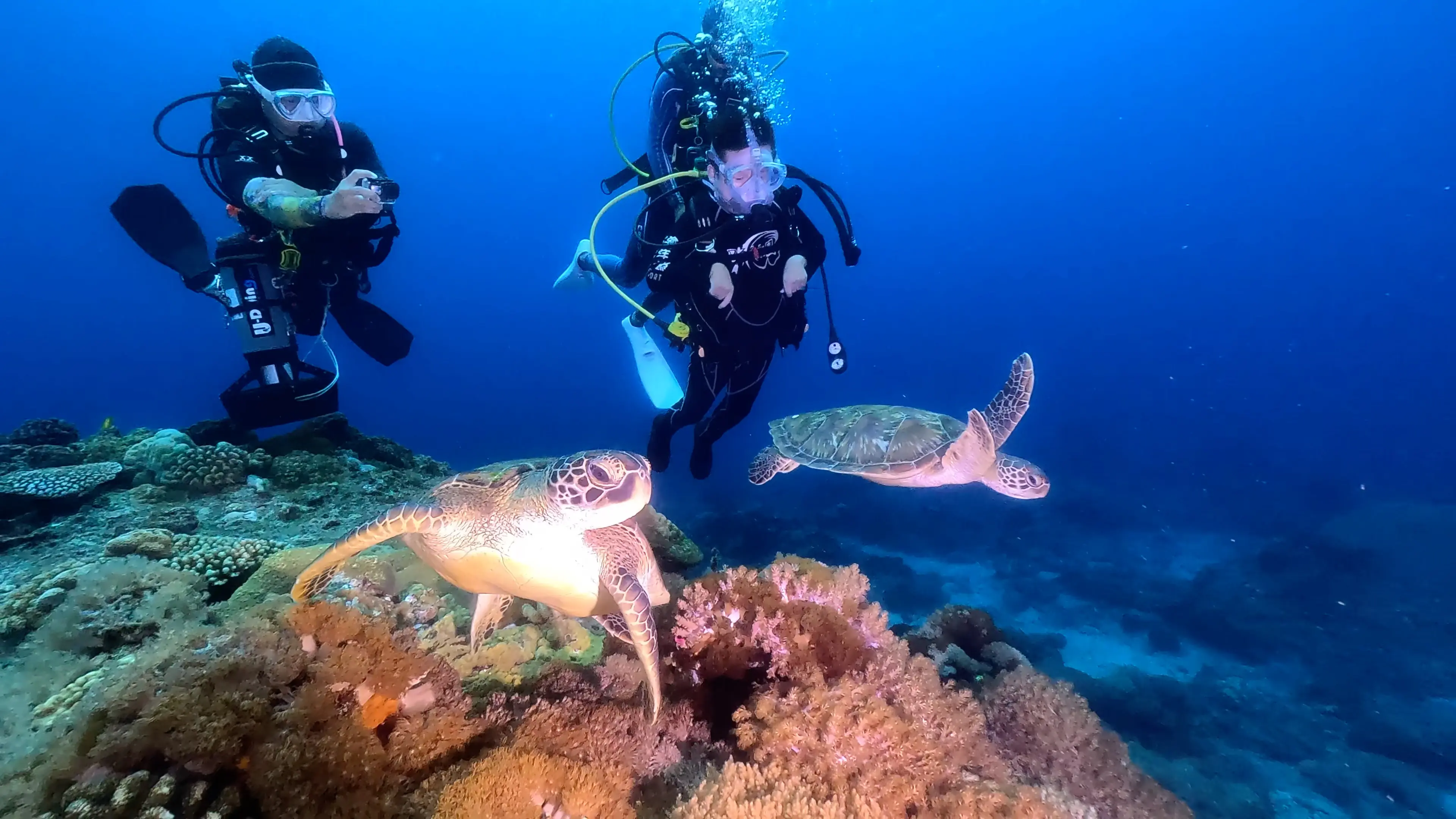 《極樂世界之好好出門》第一集主角莊富凱不懼腦麻遠征綠島潛水,透過節目終於排除阻礙實現與魚、海龜同游的夢想。 圖片提供 公視