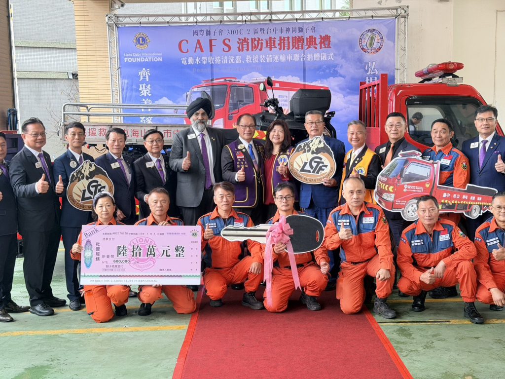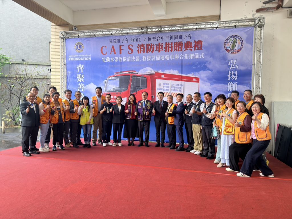 因應電動車與儲能設備火災風險日益升高,臺中市消防救災能量再升級。國際獅子會300C 2區與神岡獅子會於今(4)日上午 10時30分,在臺中市政府消防局第一救災救護大隊(臺中市豐原區圓環北路一段 321號)舉行捐贈典禮,聯合捐贈總價約新臺幣 680萬元之CAFS化學泡沫消防車,並同步提供 30台電動水帶回收清洗機及救援裝備運輸車,全面強化第一線消防應變與後勤支援能力。