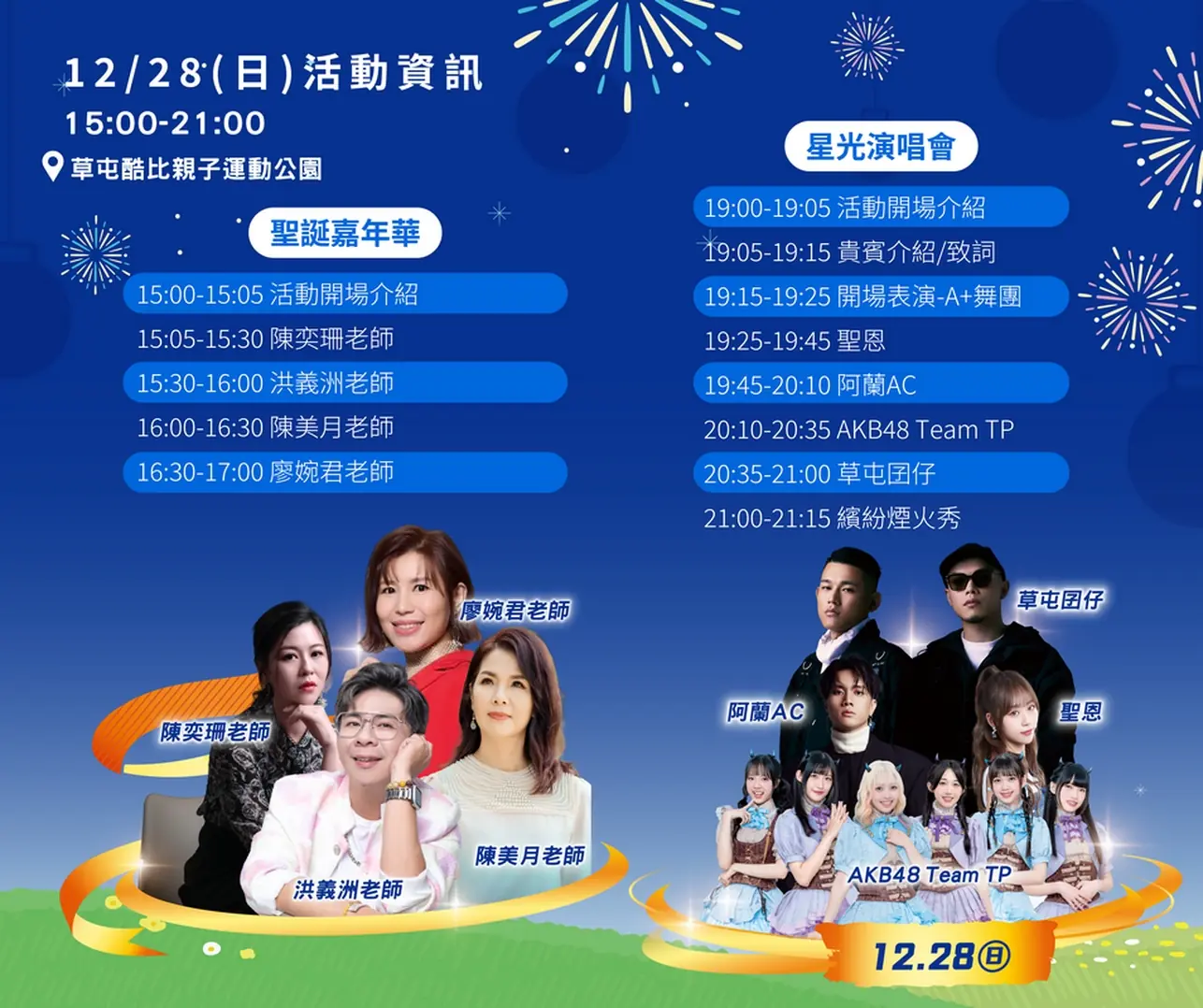12月27日、28日週末活動則自下午3點起,在草屯酷比親子運動公園登場,卡司包括安心亞、FEniX、CN吳承恩、ZORN、AKB48 Team TP、阿蘭AC、聖恩等人氣歌手,並由草屯囝仔壓軸演出,結合音樂、市集與文化展演,炒熱草屯冬季觀光。