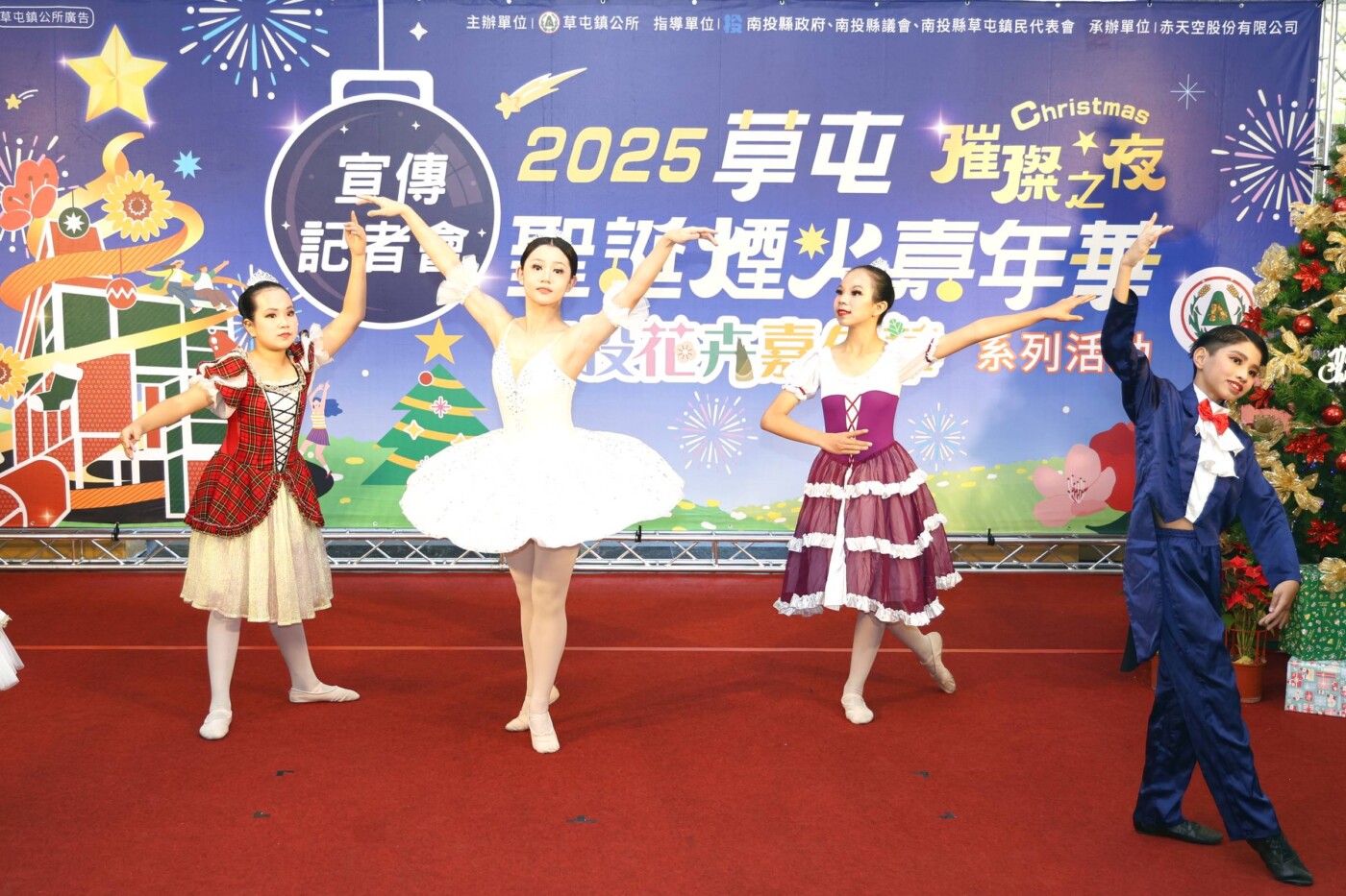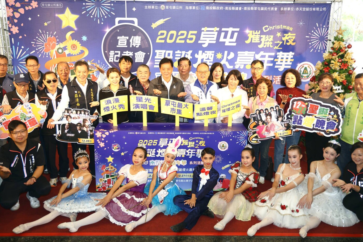 活動記者會17日在草屯鎮公所舉行,由薪傳舞蹈團小朋友熱情演出揭開序幕。草屯鎮長簡賜勝、代表縣長許淑華出席的縣府觀光處長陳志賢,以及縣議員廖梓佑、林友友、莊士傑等人到場,共同宣布活動三大亮點,包括聖誕點燈儀式、群星演唱會與連續三場煙火秀。