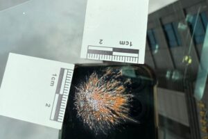 據了解,報案人林女於日前準備用車時,赫然發現前擋風玻璃出現不明的白色放射狀痕跡,中心位置呈現厚實結塊,外圍則有細碎的網狀紋路,外觀像極了子彈或彈珠類物體所造成的擊穿痕跡。文山第二分局鑑識人員審慎以對,戴上手套、仔細採集及觀察,確認是鳥類排泄物。
