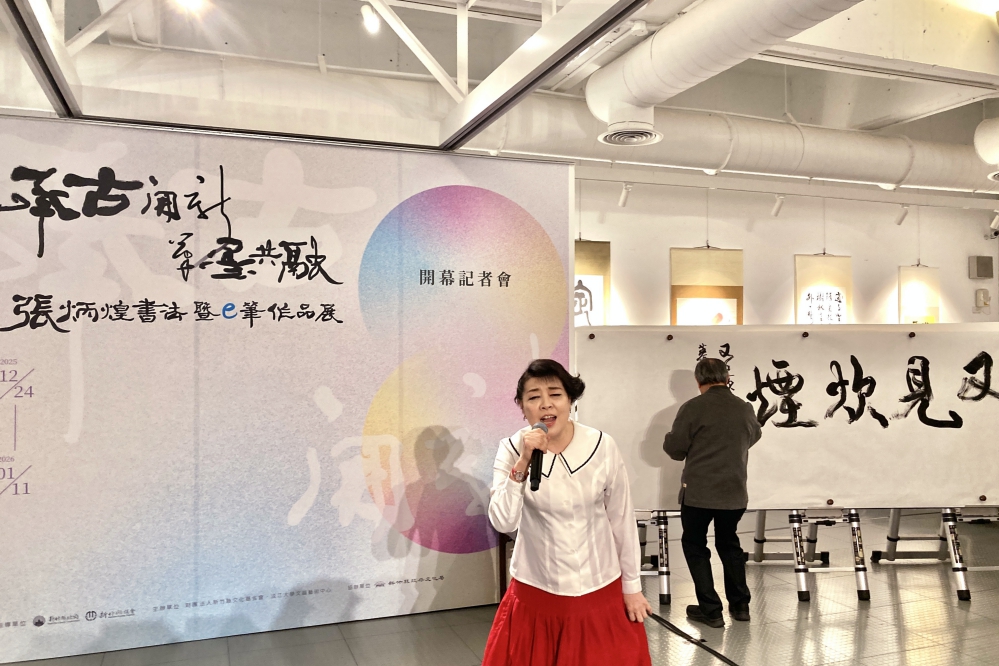 筆墨遒勁雄健,美聲柔和銀鉤,兩者藝術相遇激盪火花,週末假日在竹縣美術館成功打造一場令人讚嘆不已的視覺和聽覺跨域藝術饗宴!臺灣家喻戶曉書法名家-張炳煌教授,今(12/27)日在竹縣文化局美術館舉辦「承古開新.筆墨共融」書法暨e筆作品展。該展重頭戲邀請特別貴賓邀請與張教授擁有多年深厚友誼的聲樂家簡文秀教授蒞臨現場,並美聲高歌一曲〈又見炊煙〉,張教授即於當場隨著簡教授歌聲,立馬筆墨揮毫歌名,兩者「剛柔並濟」畫面同入現場觀眾眼廉,可謂係竹縣美術館2025年最為罕見的跨域藝術聯動饗宴!