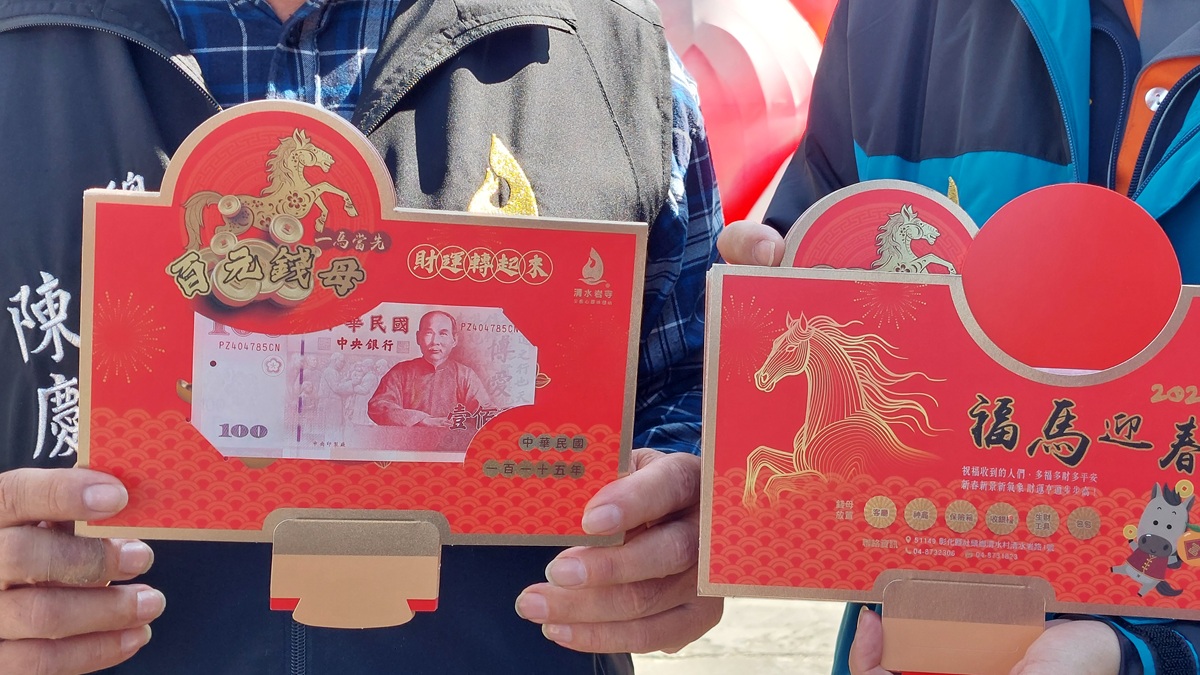 ▲活動結束後,清水岩寺將現場發送限量的「馬年百元錢母」(發財金)。(圖/記者蕭麗鳳攝)