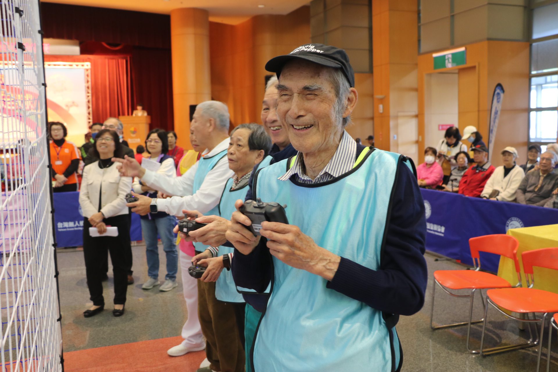 新北市首屆「銀髮x青年共創未來」無人機足球種子教練培訓成果展,現場共有 14 組由銀髮長輩與青年志工組成的聯隊同場競技,展現「活到老、玩到老、學到老」的共融精神。