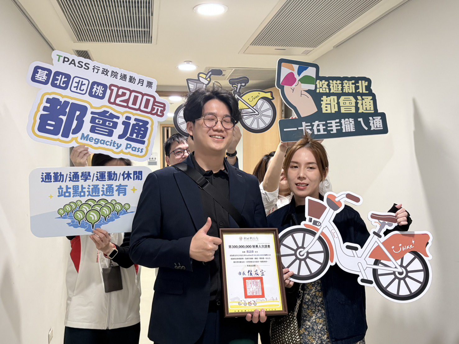 新北市YouBike公共自行車累計騎乘人次突破3億大關,新北市長侯友宜今(26日)表揚幸運的第3億人次得主——黃先生,並頒贈「1年份TPASS基北北桃1200都會通定期票」大獎。