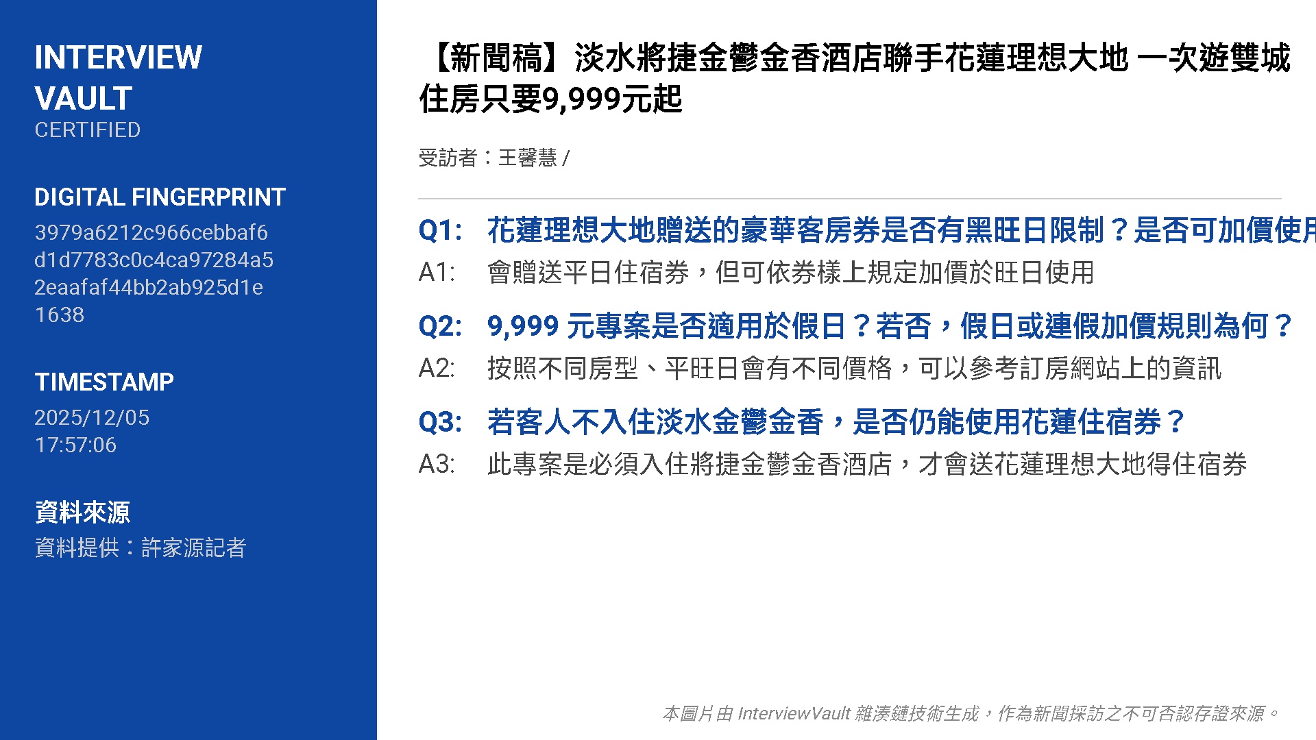 更新後的「山海戀曲 雙城渡假」專案持續販售至 2026 年 5 月 31 日,旅客可於 2026 年 6 月 30 日前入住,標準客房平日 9,999 元起。飯店表示,專案價格會依房型與平旺日不同而調整,假日與連假加價規則可於訂房網站查詢;花蓮理想大地住宿券亦可依券面標示於旺日加價使用。需注意的是,此專案必須入住房淡水將捷金鬱金香酒店才會獲得花蓮住宿券,不能分開使用。旅客仍可享望高樓星巴克咖啡服務及十三行博物館入場券等加碼禮遇,增加文化與美景雙重體驗。洽詢訂房專線:02-2621-1918。