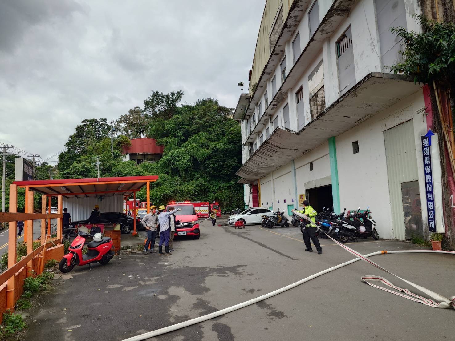 由於工廠周界內外出現刺鼻異味,經查外洩氣體為氨氣,屬《空氣污染防制法施行細則》第2條第4款所列之毒性污染物。係因氨氣貯槽輸送管線老舊破損,導致氨氣外洩並逸散至空氣中。經查廠房內無人駐守,房東亦無法立即處理,即通報消防局及警察局到場協助,並由業者會同消防人員進入廠區後,已將相關管線閥門關閉,並以灑水方式降低空氣中氨氣濃度,以防止污染持續擴散。