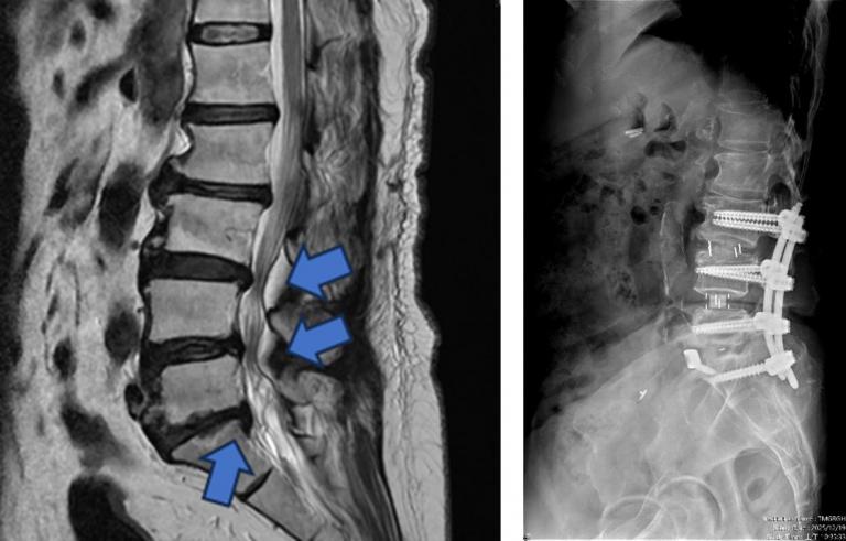 一名65歲婦人長期飽受腰痛、下肢痠麻及坐骨神經痛困擾,行走距離逐年縮短,嚴重影響日常生活。過去曾接受膝關節保膝手術及脊椎內視鏡減壓治療,初期恢復良好,但因仍存在多節段腰椎退化性狹窄與骨刺問題,加上彎腰負重與久坐習慣未能完全改善,症狀逐漸惡化,甚至出現神經性跛行。經臺中市立老人復健綜合醫院骨科部副部長林琮凱醫師詳細檢查後,診斷為第三、四、五腰椎合併第一薦椎多節段脊椎狹窄與神經壓迫。醫療團隊與病患及家屬充分溝通後,決定採用電腦導航輔助之前位/前側位脊椎融合手術,合併後方骨釘固定,一次完成多節段重建。術後病患神經症狀明顯改善,恢復行走能力,生活品質大幅提升。