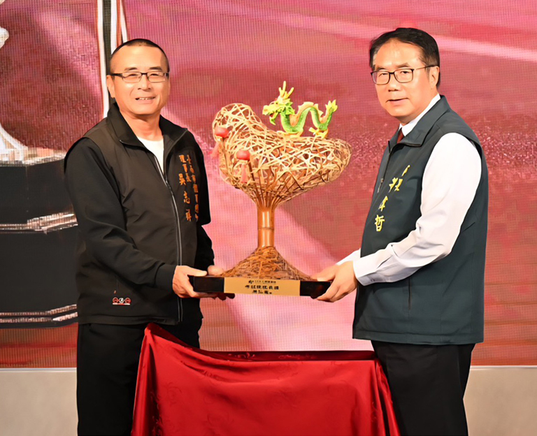 ▲臺南市體育總會吳志祥理事長獻獎給黃偉哲市長(考試院長獎)。(圖/南市府)