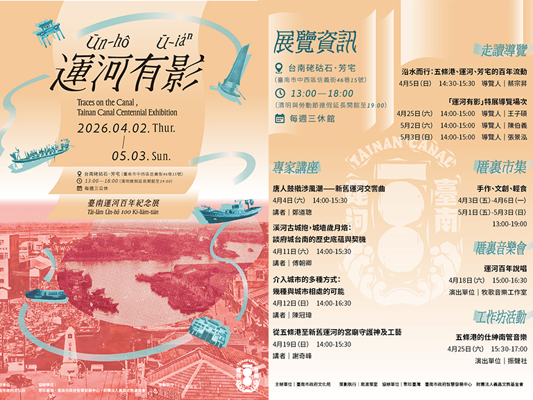 臺南市政府文化局響應今年臺南運河百年紀念活動,於今(2)日在中西區信義街芳宅辦理「運河有影——臺南運河百年紀念展」特展開幕活動,展覽自即日起至5月3日展出。開幕活動由文化局黃雅玲局長主持,出席貴賓除了展覽顧問聚珍臺灣王子碩老師,立委陳亭妃也到場致意,並邀請地方文史團體共襄盛舉,並由「曲盤聽講文化工作室」黃氏好老師分享運河相關音樂作品。