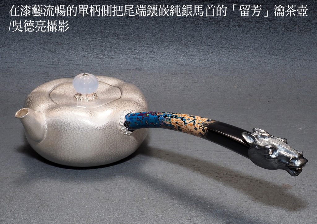而「留芳」瀹茶壺則在漆藝流暢的單柄側把尾端鑲嵌更大的純銀馬首,陳大師特別提到中國歷史上非常著名、以周穆王八駿為題材的「唐朝八駿圖」,每一匹駿馬都有名字如「絕地」、「翻羽」等神話傳說中的神駒,而且流傳至今,可說「流芳百世」,因此特別創作了一把六方體的壺,諧音「流芳」去讚揚馬。我想到的卻是唐太宗李世民為紀念其統一天下所騎的六匹戰馬而製作的青石浮雕「昭陵六駿」,當時由大畫家閻立本繪稿、閻立德雕刻,唐太宗還親自撰寫贊文,由大書法家歐陽詢書寫,具有極高的藝術價值,與「流芳」諧音更有異曲同工之妙了。