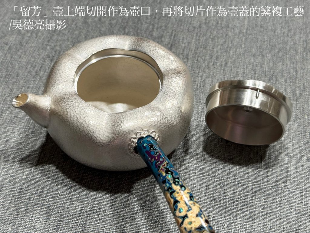 我小心翼翼將「留芳」壺端在燈下仔細觀賞,乍看十分素雅,掀開壺蓋卻發現驚人的製作難度:壺身整體鍛錘成型,上端卻切開作為壺口,再將切片作為壺蓋,繁複的工藝令人難以想像。而壺胚底部還有個缺口,尚須焊補一片銀板封底以修復成壺底。因此陳大師說整個過程不可以有一絲的怠忽。且壺蓋是下沉於壺口,因此難度更高,用上下兩片銀板做成壺口的基礎,再加上壺蓋牆,使得穩固,同時也不致翻蓋;正所謂「不精不誠,何以動人」吧?