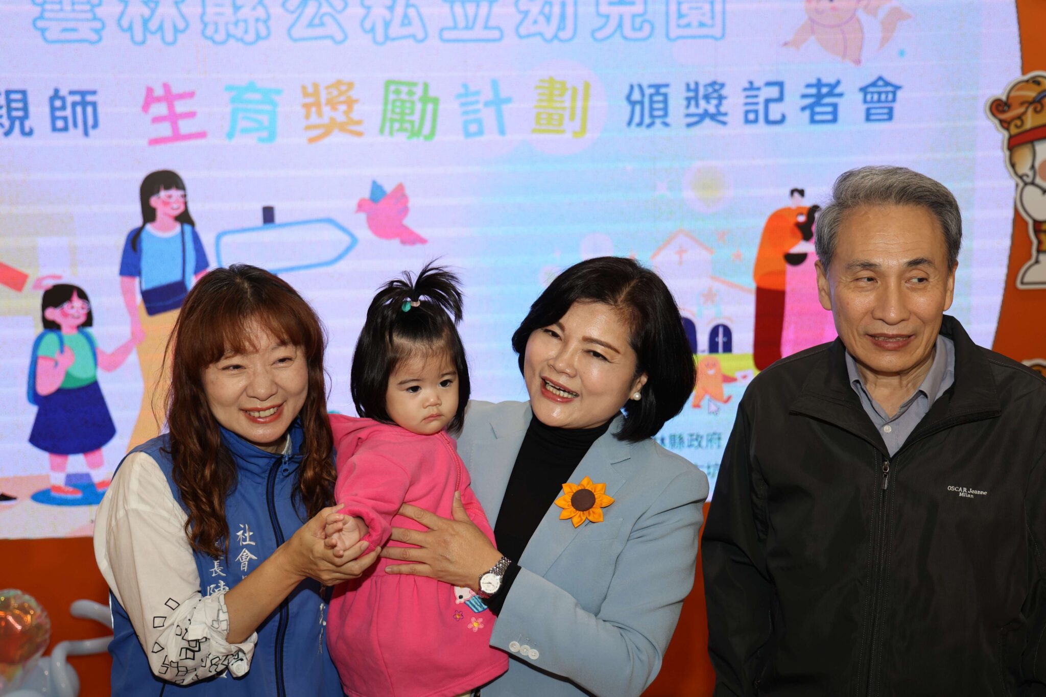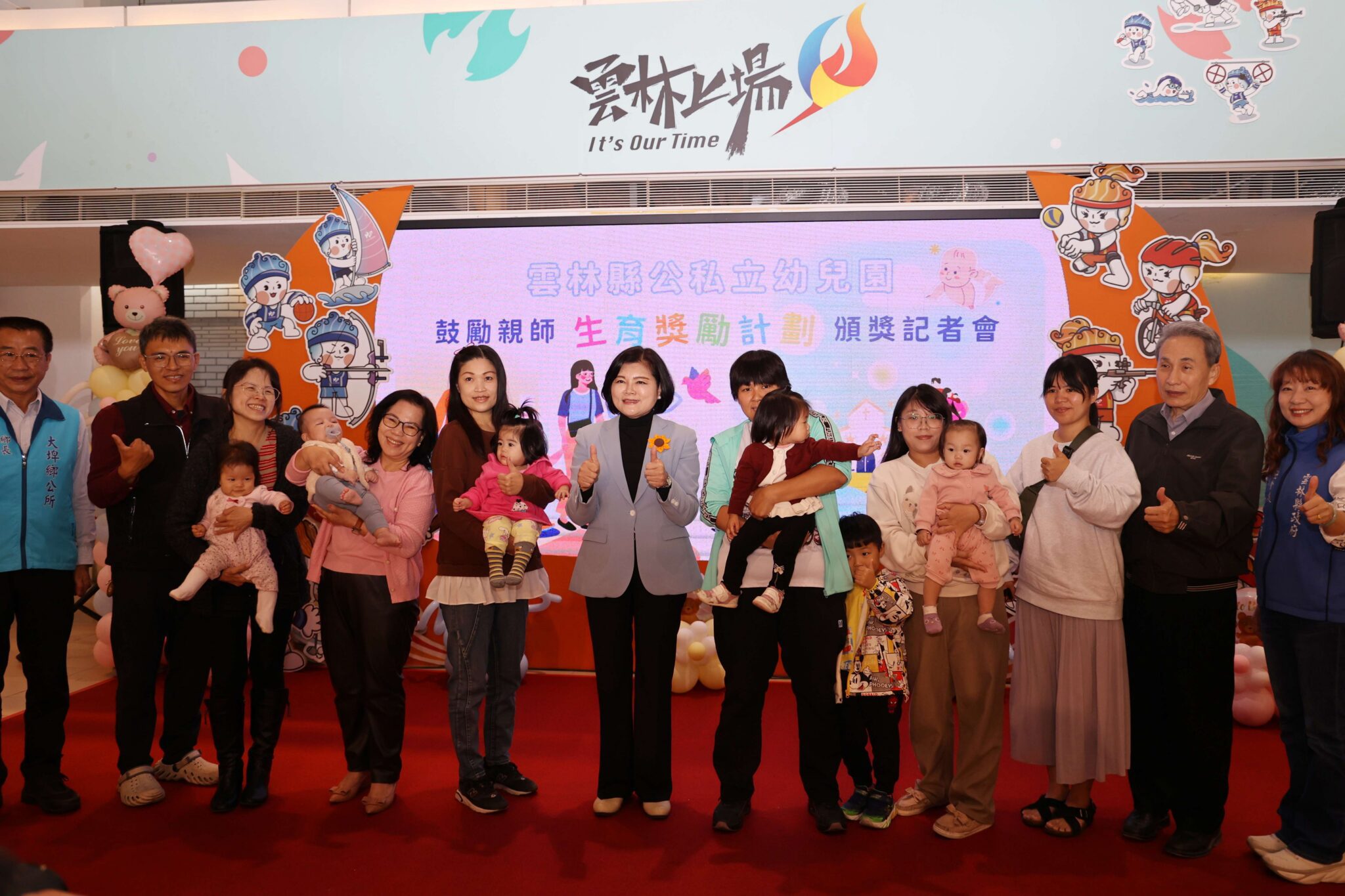 雲林縣政府今(3)日上午於縣府親民大廳舉辦「雲林縣公私立幼兒園鼓勵親師『生育獎勵』計畫頒獎記者會」,許多家長帶著寶貝共襄盛舉據統計,夫妻婚後生第一胎比率約58%、第二胎38%,意願生至第三胎比率只有8.9%,第四胎更只剩不到3%,依此情況人口數只會越來越低。為促進生育率,雲林縣除提高生育補助外,也鼓勵幼兒園協助將政策推廣,透過生育獎勵,鼓勵幼兒園家長能夠勇於再生第二胎、第三胎、第四胎,張麗善縣長強調,雲林縣政府會是所有家庭最堅強後盾,歡迎更多年輕家庭把「幸福人生」從雲林開始。