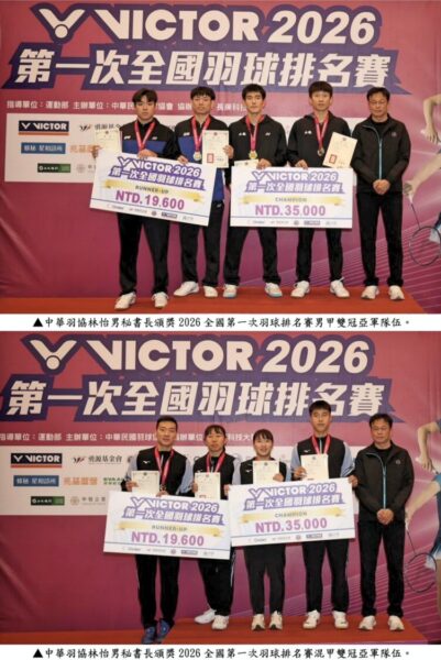 【焦點時報/記者羅蔚舟報導】天氣冷颼颼,但擋不住台灣羽球的熱力十足!2026全國第一次羽球排名賽1月3日在長庚科技大學體育館展開甲組各項決賽,主辦單位中華民國羽球協會(以下簡稱中華羽協)表示,甲組男雙由土銀北市大的林秉緯/陳政寬擊退從會外賽闖入決賽的亞柏國體大的何志偉/黃睿璿,奪下排名賽第一次的男雙冠軍。甲組女雙以及混雙決賽則是由中租球團成為最大贏家,女雙冠軍是由去年才開始合作的”雙林配”林琬清/林芷均拿下,混雙冠軍則是楊筑云/楊博智再為中租拿下冠軍。