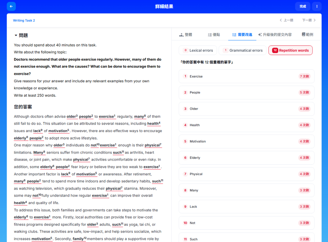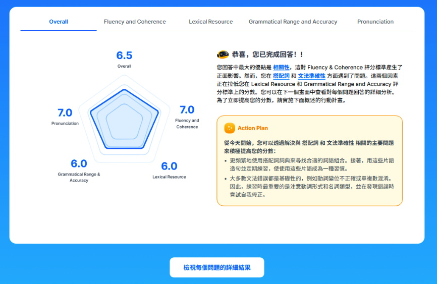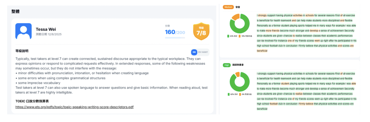 其次,平台的 AI 評測系統特別強化口說與寫作分析,提供發音、連貫性、任務完成度與文法準確度等結構化回饋,解決自學者最難掌握的關鍵項目。