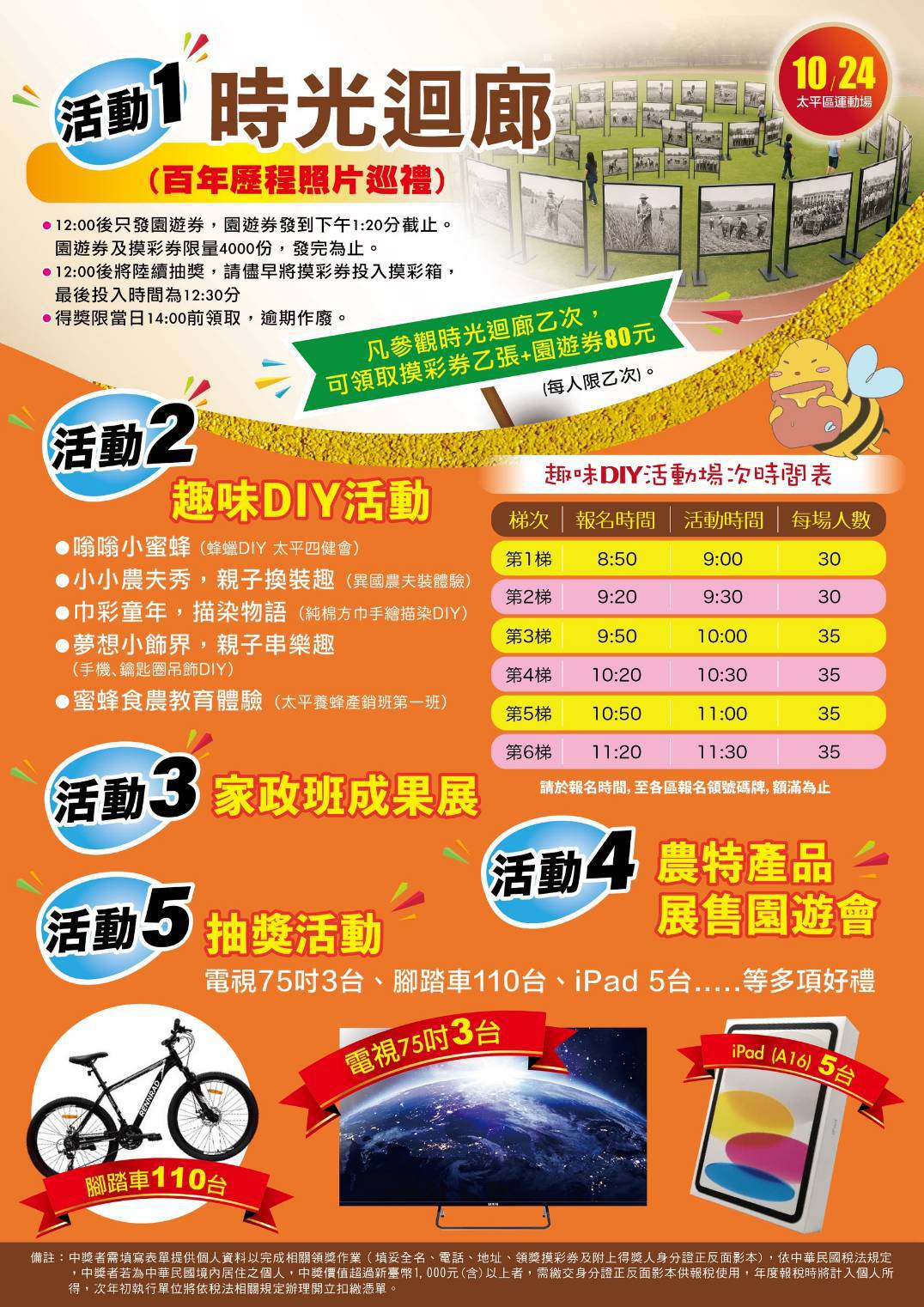 墨新聞|記者馬源培/台中報導 為歡慶台中市太平區農會創立100週年,台中市政府農業局輔導太平區農會,將於10月24日上午8時20分,在太平區運動場舉辦「太平區農會創立一百週年暨農民運動會活動」,活動內容精彩多元,農業局誠摯邀請市民朋友踴躍到場,感受太平區農業的百年風華與活力。 農業局說明,活動現場除舉辦農民運動會外,還特別規劃時光迴廊-百年歷程照片巡禮,帶領大家一起走進太平區農會一世紀的發展軌跡,一同認識在地農業文化的傳承與變遷,並發表家政推廣成果展,展現農會多年來深耕地方的努力與成果。 農業局表示,為了讓民眾體驗多元農業魅力,活動也邀請本市各區農會農特產品展售攤位、青農市集及家政班美食攤位;並規劃多種趣味DIY活動,包括蜂蠟製作、農夫裝換裝體驗、純棉方巾描染與吊飾創作及蜜蜂食農教育體驗,讓大家不僅能逛成果展、參與運動會、體驗DIY,還能選購到優質在地農產品及抽獎活動,享受在地農業盛會。 農業局進一步說明,太平區農會長期推動農業發展與輔導農民,其中「太平枇杷」更是全台知名優質農產品,金黃飽滿、香甜多汁,是太平區重要農業代表。市府與農會長期攜手推廣在地產業,也期望藉由百週年慶祝活動,凝聚更多市民支持與關注,讓太平農業持續茁壯。 太平區農會創立一百周年慶暨農民運動會活動DM 此篇文章最開始出處為: 太平區農會慶百年 農民運動會及農產展售和手作攤位邀市民同歡