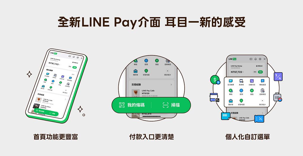 配合新電支服務的啟動,LINE Pay介面同步大幅改版,聚焦於首頁整合與個人化操作,讓用戶能更快速找到常用功能。升級後的首頁將整合LINE Pay Money、交易紀錄、好康地圖、旅遊服務、金融項目與公益捐款等內容;同時新增自訂「我的選單」功能,用戶可依需求排列常用服務,讓支付與生活應用變得更精準也更直覺。官方提醒,為確保服務正常銜接,所有用戶必須在12月3日前完成LINE App與LINE Pay App的版本更新,否則將無法正常使用新介面與電支功能。