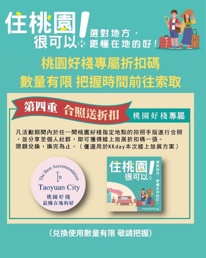 桃園市政府觀光旅遊局集結桃園23家旅宿於KKday平台推出「住桃園很可以!」旅宿線上旅展,為響應民眾支持及擴大「桃園好棧」優質旅宿品牌宣傳效益,活動持續開放至11月30日止!並加碼推出滿額折抵促銷活動,凡於「住桃園很可以!」線上旅展訂購滿2,500元的旅客,立即享有500元的現金折扣,還有機會把機票、GoPro Hero最新款相機、太平洋折疊自行車、Airpods 4等獎品帶回家!另11月7日至10日將搭配ITF台北國際旅展桃園館舉辦線上旅展互動遊戲,歡迎民眾踴躍參與,有機會獲得限量「舒華小卡」。