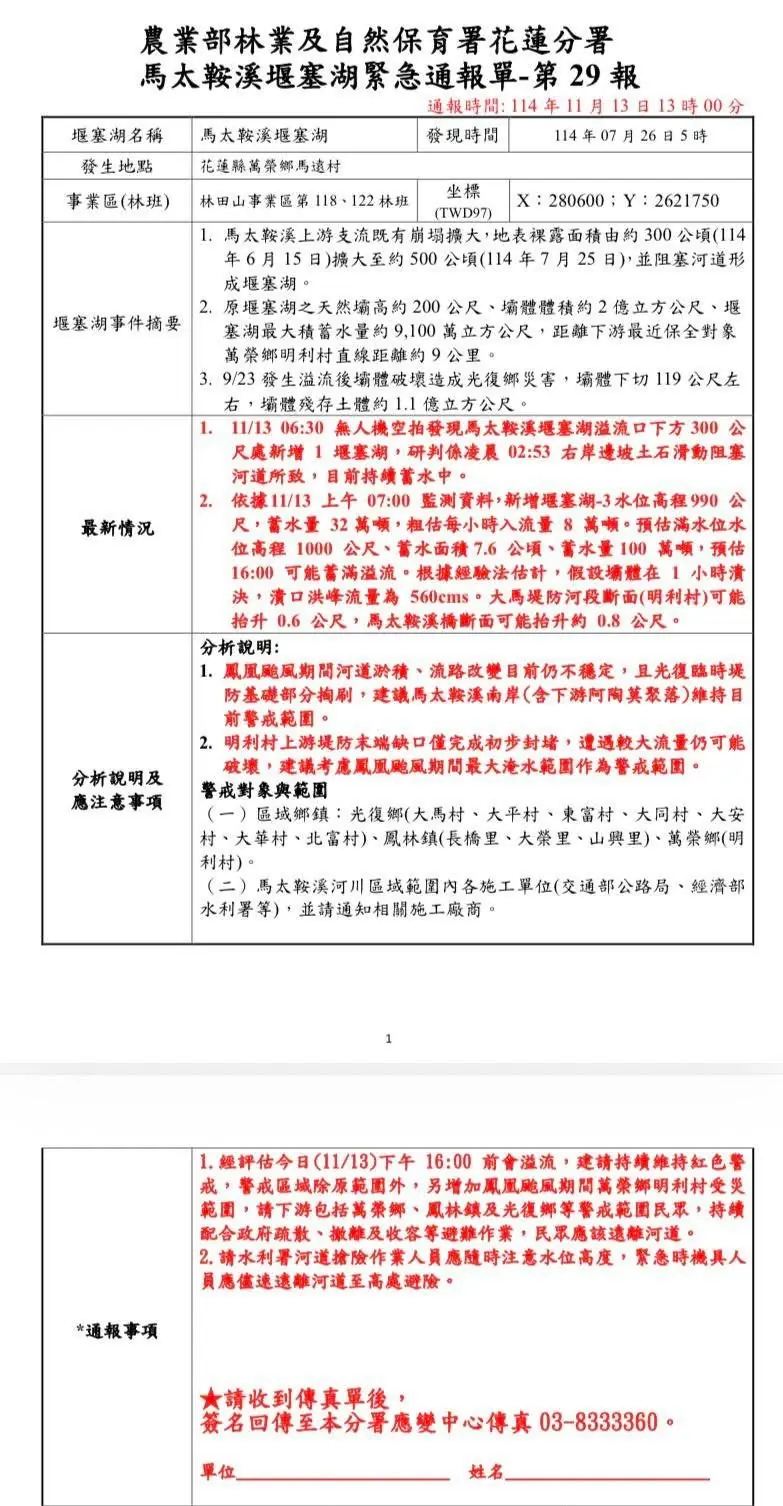 鳳凰颱風警報昨晚八時半才剛解除,短短不到數小時,農業部今天清晨緊急通報「無人機空拍發現馬太鞍溪新增堰塞湖」,對光復、鳳林、萬榮的鄉親而言,堰塞湖仍在、紅色警戒未解除,便意味生活始終被懸掛在一顆不定時炸彈。以馬太鞍溪再度溢流造成萬榮鄉明利村淹水為例,印證堰塞湖的潰決與隱憂,已不僅僅是地質或水利問題,而是整個國家防災治理能力的重大考驗。