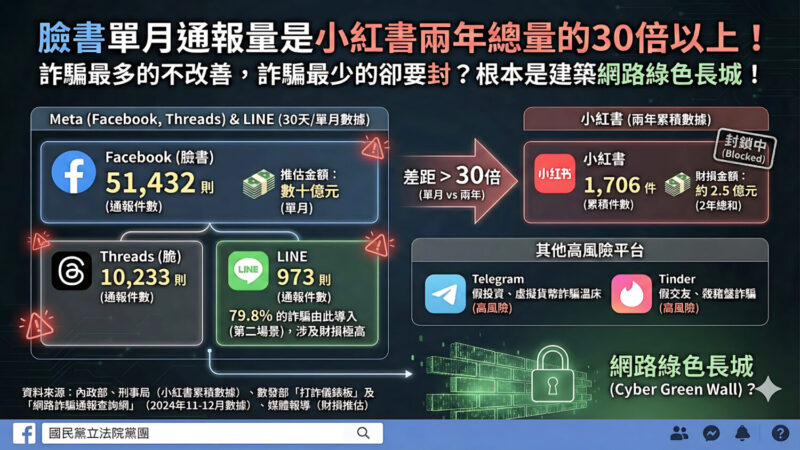 (焦點時報/鄒志中報導) 內政部日前以「小紅書」在國安資安檢測中全數不合格,且涉及高達一千七百餘件詐騙案、財損近二點五億元為由,宣布將依《詐欺犯罪危害防制條例》的「緊急事件」規定,對該應用程式執行為期一年的「停止解析及限制接取」命令,影響台灣超過300萬名用戶。國民黨立法院黨團立即召開 “封殺小紅書 假反詐真鎖國” 記者會抨擊,賴政府要學對岸鎖國作法?在台灣廣蓋「綠色數位長城」?要求政府立刻撤回封鎖命令。