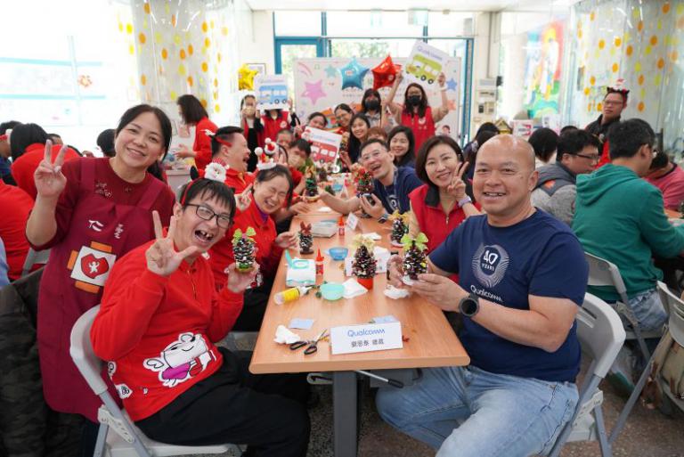 ▲高通劉思泰總裁(右1)與高通志工陪伴服務對象以環保精神動手創作松果聖誕樹。(圖/_新竹仁愛基金會提供)