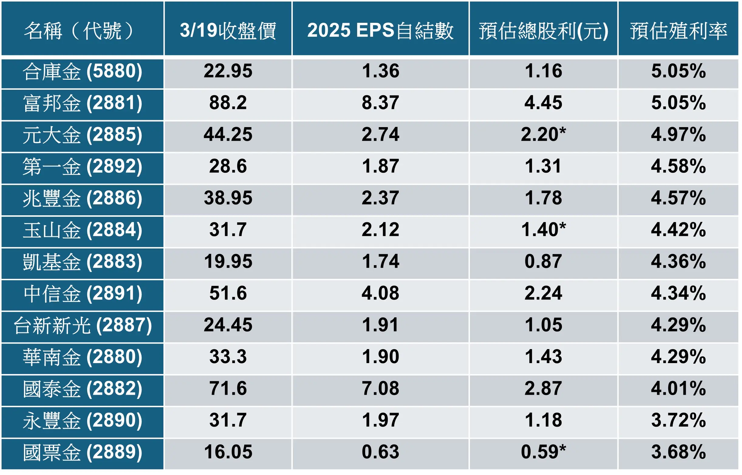13家金控預估殖利率