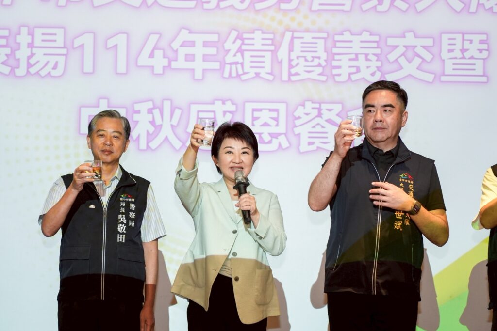 台中市交通義勇警察大隊於今(17)晚在与玥樓頂級粵菜餐廳舉辦「114年度秋節聯誼暨績優交通義勇警察表揚」活動,現場表揚38位資深及在執勤表現績優的義交楷模。市長盧秀燕在警察局長吳敬田陪同下出席,向義交夥伴表達最誠摯的謝意,期勉義交夥伴再接再厲,讓城市交通事故與死傷再下降,達成「交通順暢、人人平安」的目標,打造更平安、更幸福的台中。